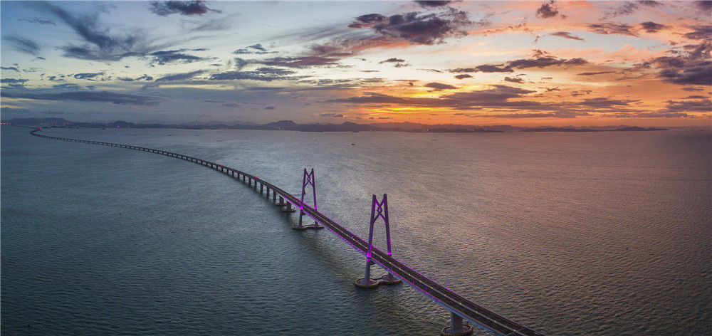 2018年7月18日,廣東珠海,滿天紅霞,亮燈后的港珠澳大橋跨立在伶仃洋上,進(jìn)入通車(chē)前的最后準(zhǔn)備。張由瓊/視覺(jué)中國(guó)