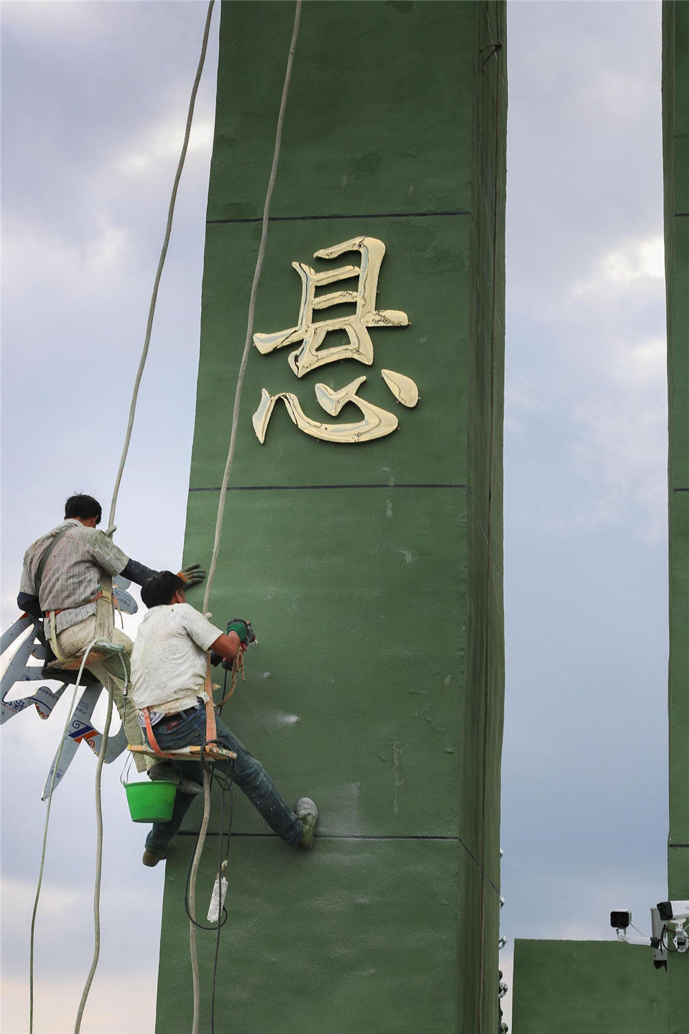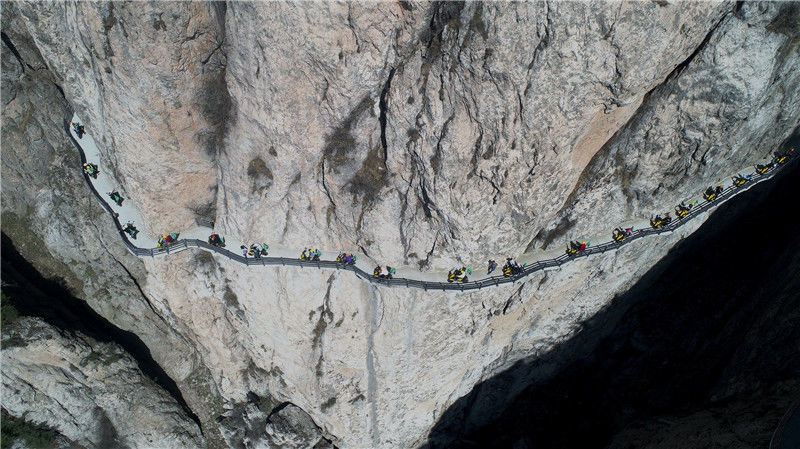 2018年4月3日,河南洛陽,志愿者在千米懸崖棧道上“飛檐走壁”,騎共享電車呼吁環(huán)保。DF/視覺中國