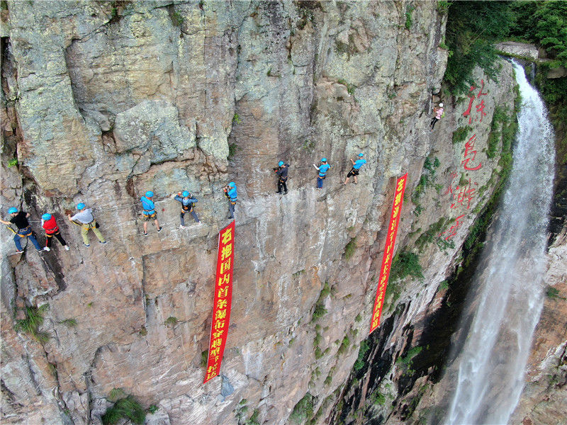 2018年7月29日,水袖舞愛好者在重慶市南川區(qū)金佛山絕壁棧道上“秀”水袖舞。瞿明斌/視覺中國