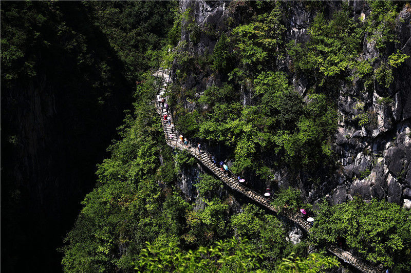 2019年9月13日,游客在重慶市黔江區(qū)城市峽谷景區(qū)芭拉胡的懸崖棧道上游玩。當(dāng)天是中秋節(jié)假的第一天。楊敏/視覺中國編輯/陳進
