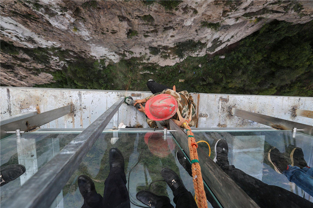 2018年6月28日,廣東清遠古龍峽的玻璃大峽谷,是集玻璃平臺、玻璃棧道、玻璃橋為一體的高空觀光玻璃組合,同時融入了5D破裂效果,并設(shè)有玻璃懸廊、玻璃臺階、凌空微步等高空挑戰(zhàn)產(chǎn)品。曾令華/視覺中國