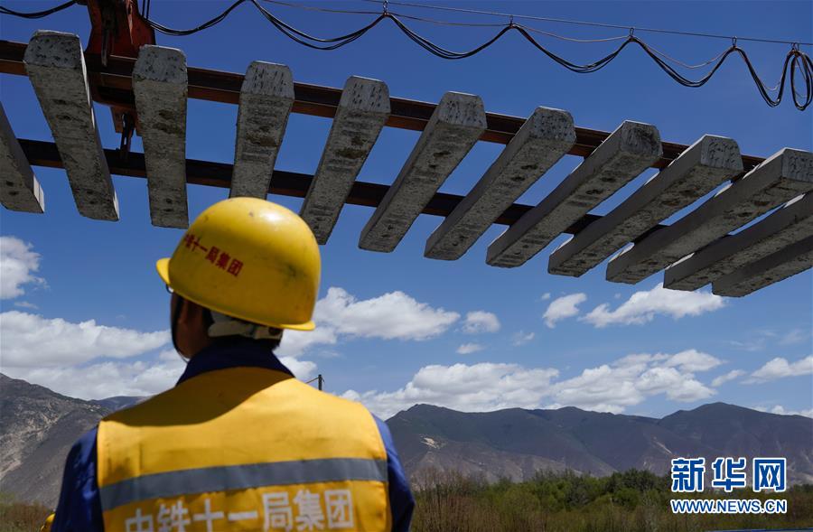 6月6日,負(fù)責(zé)鋪軌的中鐵十一局集團(tuán)的建設(shè)者在現(xiàn)場作業(yè)。新華社記者普布扎西攝