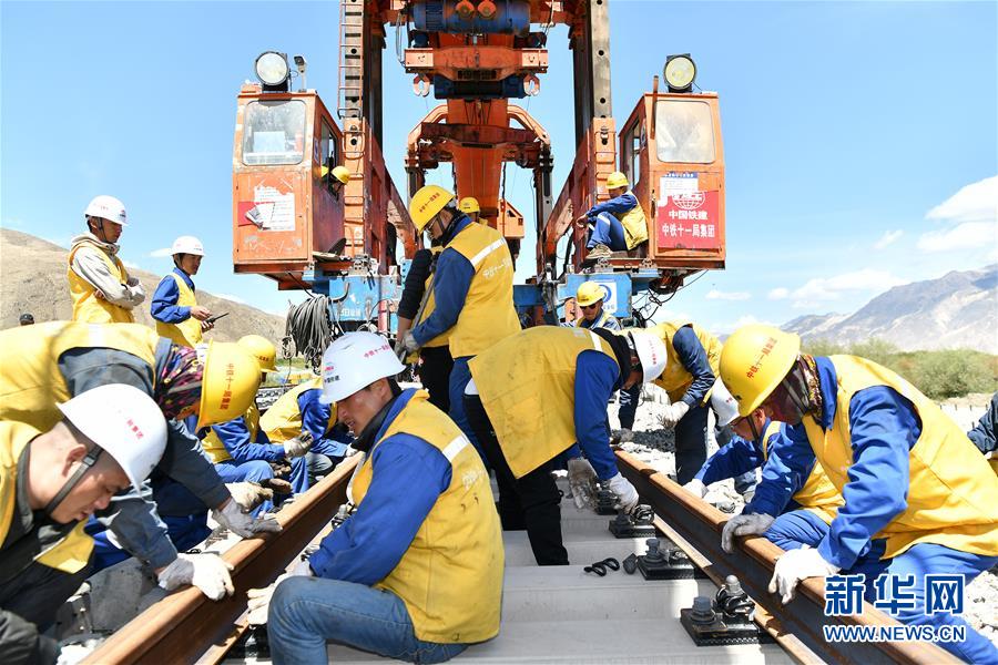 6月6日,負(fù)責(zé)鋪軌的中鐵十一局集團(tuán)的建設(shè)者在現(xiàn)場(chǎng)作業(yè)。新華社記者李鑫攝