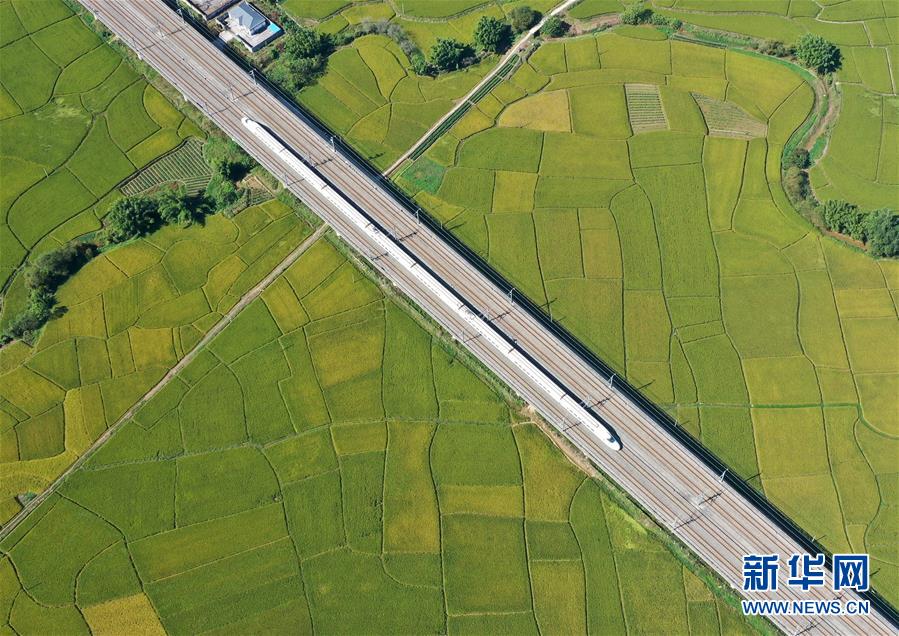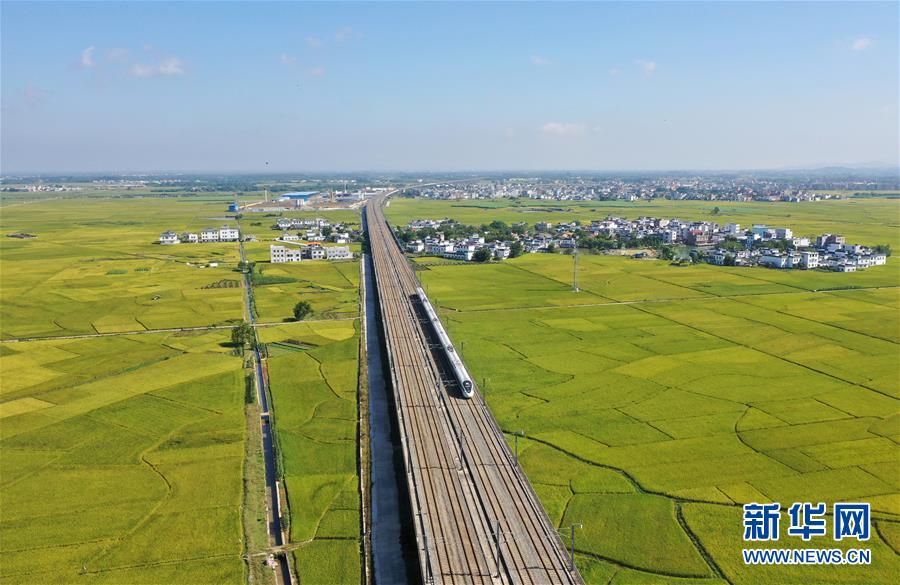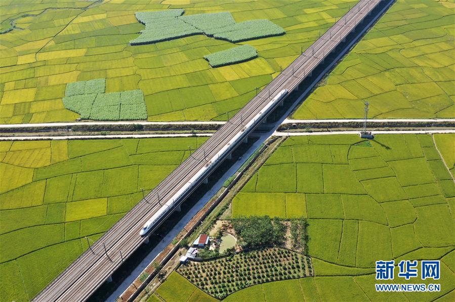 眼下,廣西賓陽縣古辣鎮(zhèn)大面積稻田進入收獲期,一列列南來北往的動車從稻田間飛馳而過,構(gòu)成一幅幅美麗的豐收圖畫。