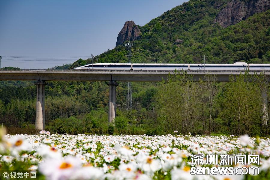 2019年4月8日,一列高鐵列車從京福高鐵安徽銅陵段一片盛開的鳳丹花海中駛過。