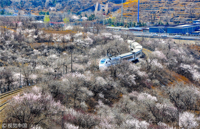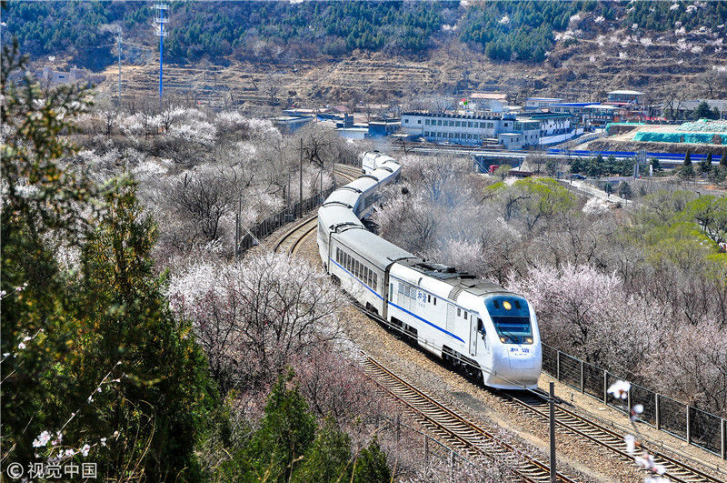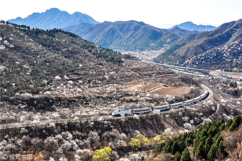 2019年3月22日,北京居庸關(guān)附近的山花盛開,S2線列車穿行在花海之中,構(gòu)成一幅美麗的畫面。時永平/千龍圖像/視覺中國編輯/陳進