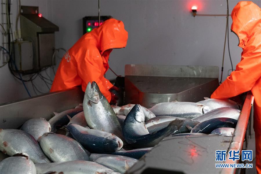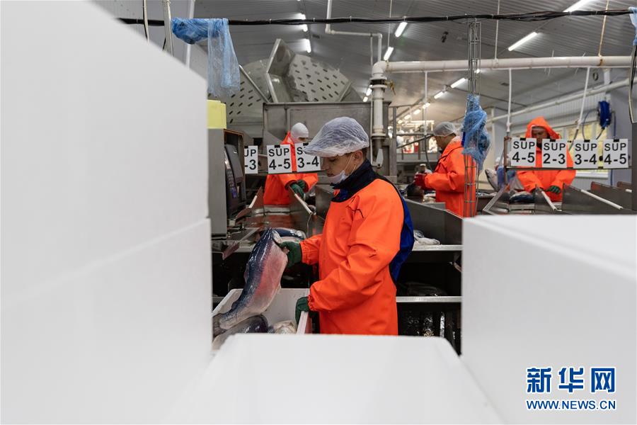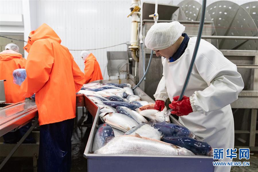 9月13日,在俄羅斯摩爾曼斯克,俄羅斯水產(chǎn)養(yǎng)殖公司工作人員在車(chē)間處理鮭魚(yú)。  新華社記者白雪騏攝