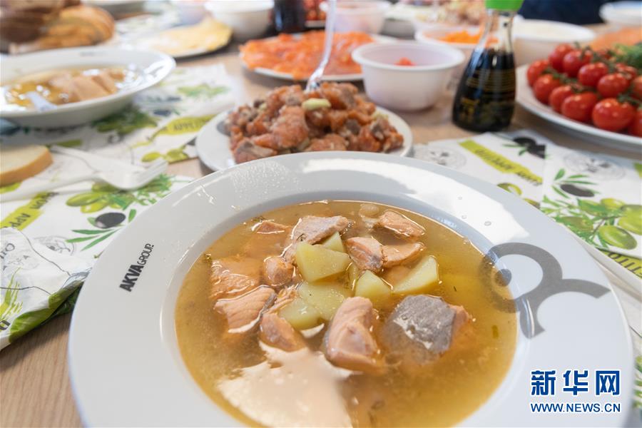 這是9月13日在俄羅斯摩爾曼斯克以北的巴倫支海域的鮭魚(yú)養(yǎng)殖場(chǎng)拍攝的鮭魚(yú)湯。  新華社記者白雪騏攝
