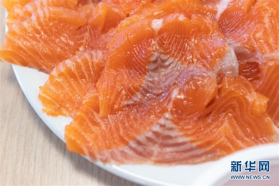 這是9月13日在俄羅斯摩爾曼斯克以北的巴倫支海域的鮭魚(yú)養(yǎng)殖場(chǎng)拍攝的鮭魚(yú)肉片。  新華社記者白雪騏攝