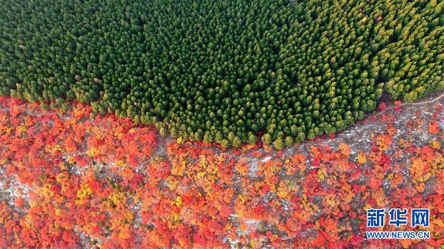 火紅的黃櫨樹林與綠色的松林沿濟(jì)南蝎子山山脊分布(11月4日無(wú)人機(jī)拍攝)。 新華社記者 朱崢 攝