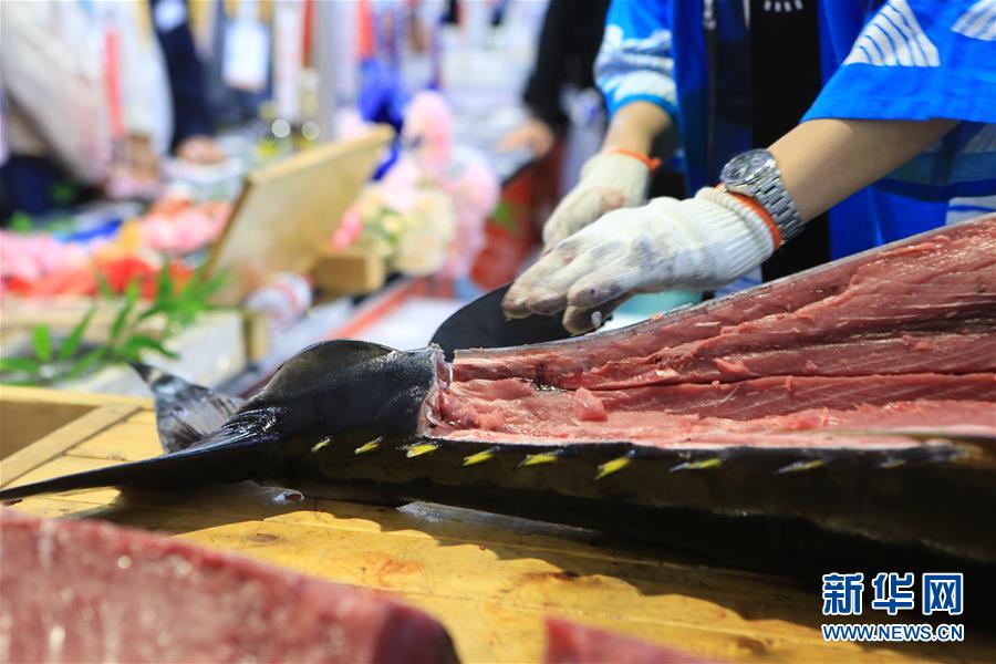 11月7日,來自日本長崎魚市株式會社的專業(yè)切魚師傅在現(xiàn)場解體70公斤藍(lán)鰭金槍魚。第二屆中國國際進(jìn)口博覽會正在上海國家會展中心舉行。博覽會的食品及農(nóng)產(chǎn)品展區(qū)里匯集了來自世界各地的美食,同時也上演各種精彩美食秀。11月7日,來自日本長崎魚市株式會社的專業(yè)切魚師傅現(xiàn)場解體一條70公斤的藍(lán)鰭金槍魚,吸引大量參觀者觀看、品嘗。新華社記者隋先凱攝