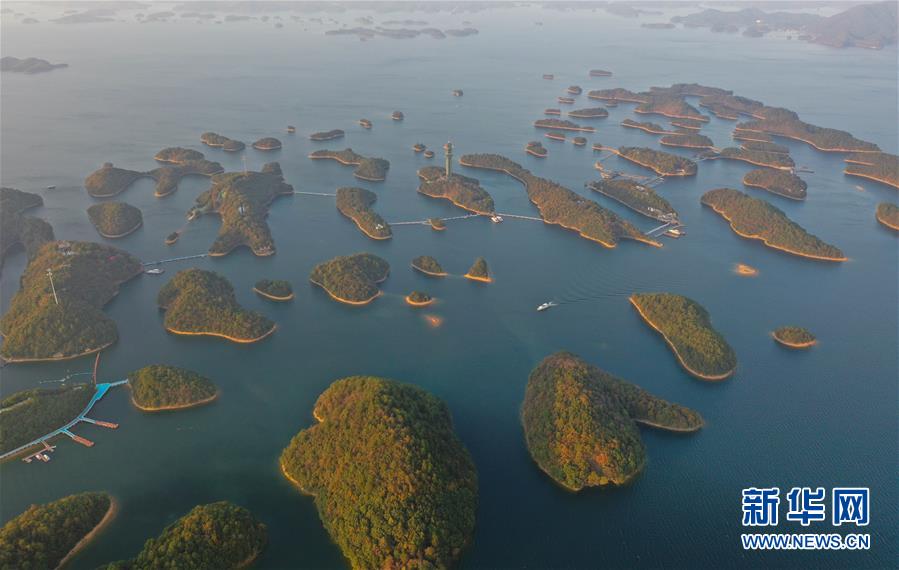 11月9日無人機拍攝的廬山西海。 當日,落日余暉下的江西廬山西海山青水藍,美不勝收。 新華社記者 周密 攝