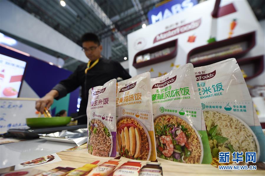 這是在第二屆進博會瑪氏公司展臺拍攝的“我的食刻”方便米飯產品(11月7日攝)。新華社記者尹炣攝