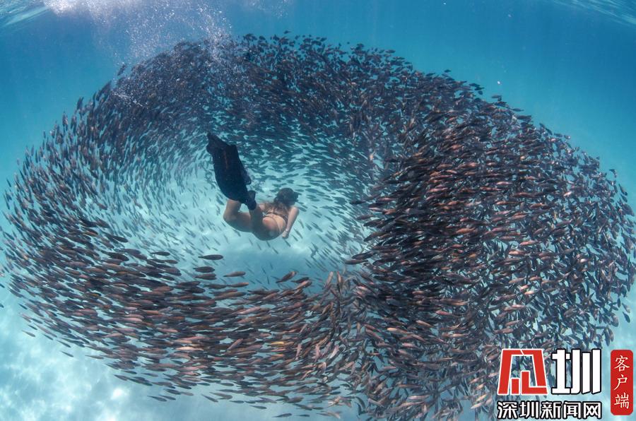 2019年3月12日?qǐng)?bào)道(具體拍攝時(shí)間不詳),澳大利亞21歲的姑娘L(fēng)illy Palmer和朋友在西澳大利亞州西北海岸的寧格羅礁邂逅鸚嘴魚“風(fēng)暴”,Lilly用相機(jī)拍下了朋友潛進(jìn)鸚嘴魚群的畫面。照片中,鸚嘴魚群組成一個(gè)球形“風(fēng)暴”,仿佛將Lilly的朋友一個(gè)個(gè)吸進(jìn)去一樣,畫面分外震撼。