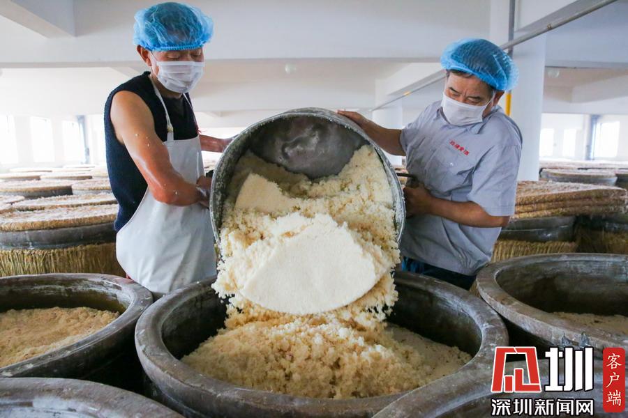 2019年11月13日,江蘇省如皋市白蒲鎮(zhèn)一釀酒廠,工人在進(jìn)行二次喂飯工藝操作。