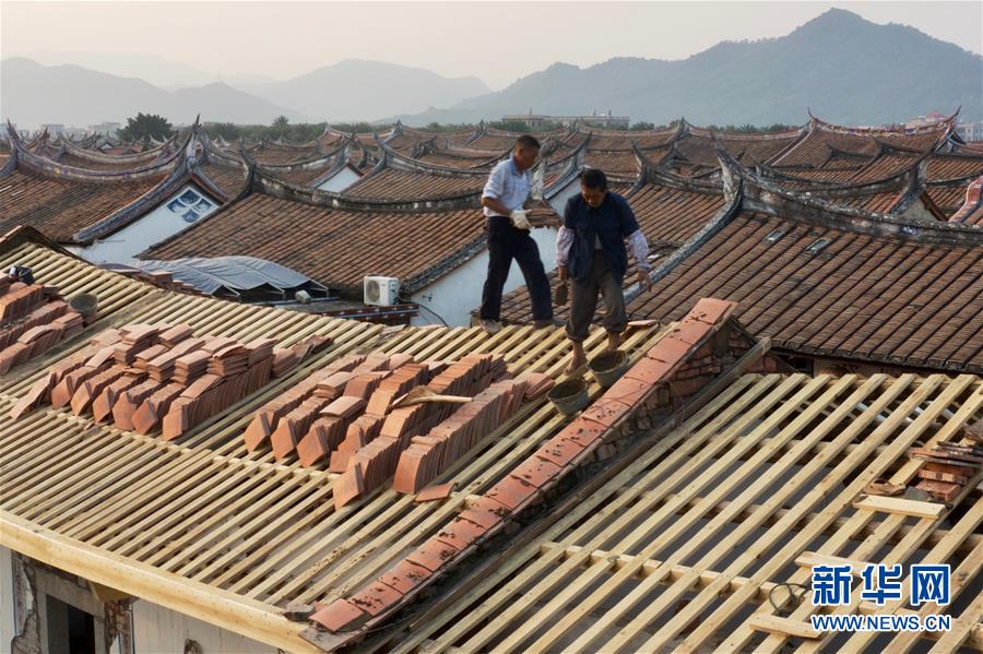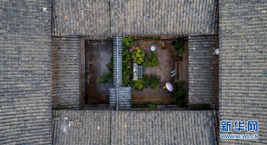 11月14日,埭美村村民在修繕一座古民居(無人機(jī)拍攝)。新華社記者姜克紅攝