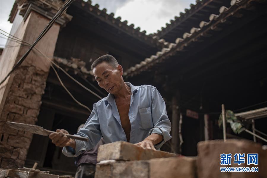 工人王建雄在修繕石屏縣異龍鎮(zhèn)符家營村189號民居的圍墻(8月8日攝)。新華社記者江文耀攝