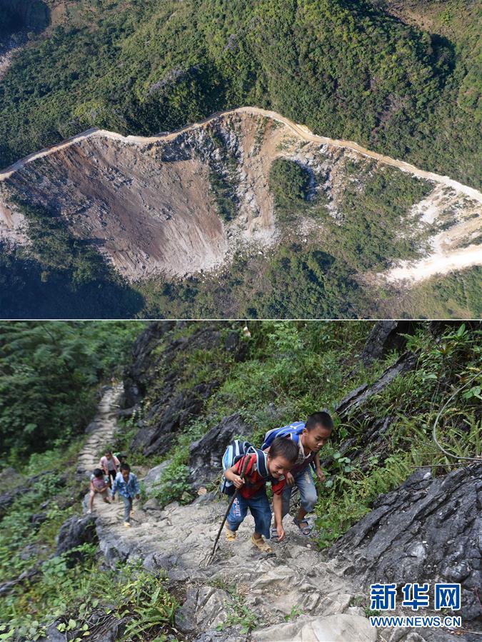 拼版照片:上圖為大化瑤族自治縣七百弄鄉(xiāng)弄良村弄丘屯剛剛修通的公路(右下段)和村道、鄉(xiāng)道連接(11月12日無(wú)人機(jī)拍攝);下圖為在尚未通路的弄良村弄丘屯,孩子們爬“天梯”回家(2016年12月9日攝)。新華社記者黃孝邦攝