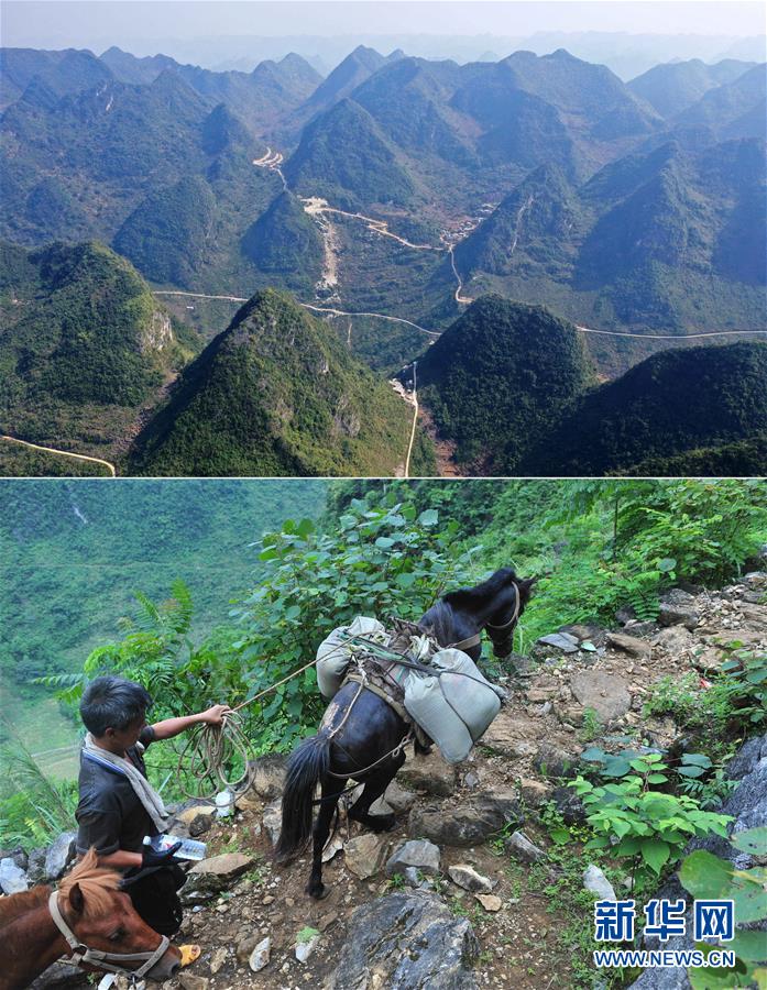 拼版照片:上圖為已經(jīng)修通公路的大化瑤族自治縣板升鄉(xiāng)弄勇村弄為屯以及周邊村屯(11月11日無人機(jī)拍攝);下圖為在弄勇村弄為屯,村民用馬將建筑材料馱回家,用于修建新房(2014年6月18日攝)。