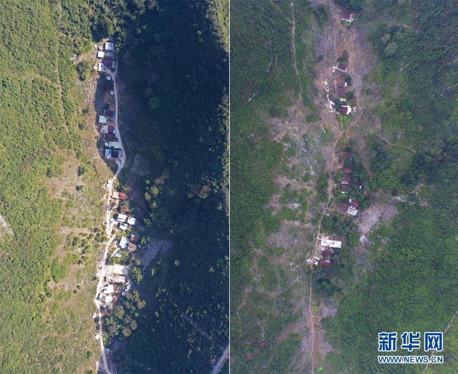 拼版照片:左圖為剛剛修通水泥路的大化瑤族自治縣板升鄉(xiāng)八好村弄研屯(11月11日無人機拍攝);右圖為尚未通路的八好村弄研屯(2015年11月3日無人機拍攝)。新華社記者黃孝邦攝