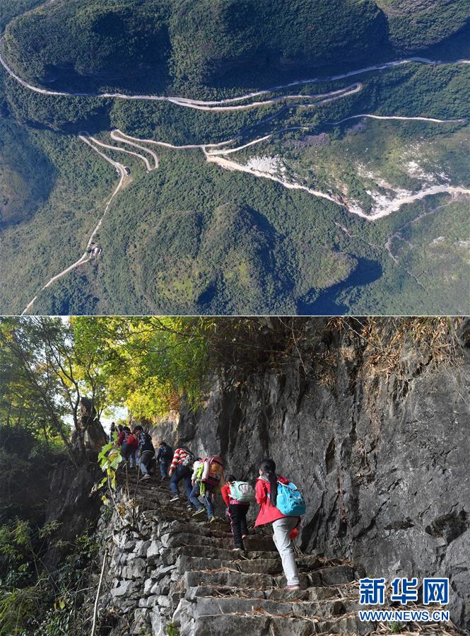 拼版照片:上圖為大化瑤族自治縣七百弄鄉(xiāng)弄良村弄丘屯剛剛修通的公路(右下段)和村道、鄉(xiāng)道連接(11月12日無(wú)人機(jī)拍攝);下圖為在尚未通路的弄良村弄丘屯,孩子們爬“天梯”回家(2016年12月9日攝)。新華社記者黃孝邦攝