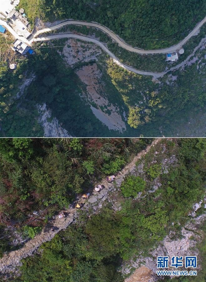 拼版照片:上圖為已經(jīng)修通水泥路的大化瑤族自治縣板升鄉(xiāng)八好村八好屯(11月11日無人機拍攝);下圖為在尚未通路的八好村八好屯,村民背著化肥走山路回家(2016年4月15日攝)。新華社記者黃孝邦攝