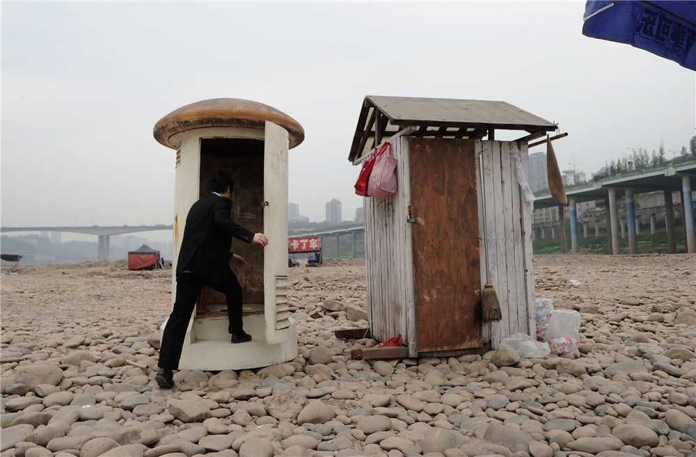2013年04月02日,重慶,干枯河床上修建了臨時(shí)公共廁所。大動(dòng)/視覺中國(guó)
