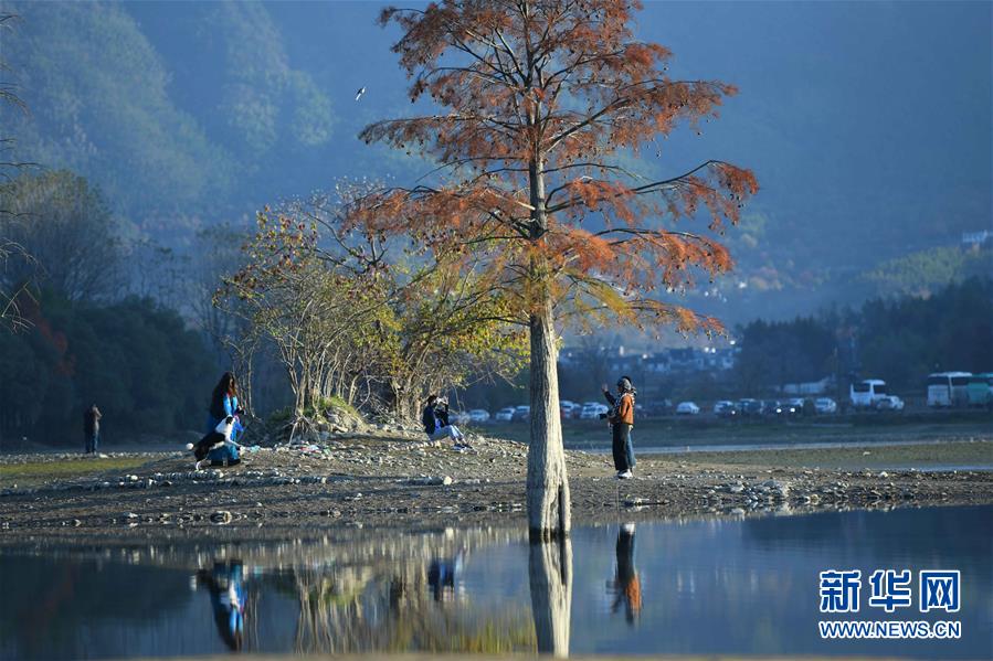 11月14日,一名游客在安徽黟縣奇墅湖拍照。新華社記者韓曉雨攝