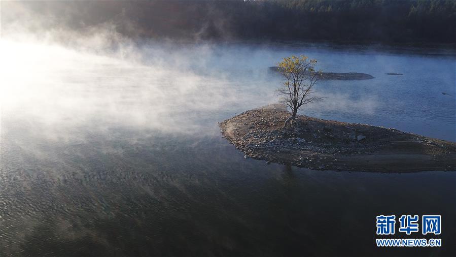 11月14日無(wú)人機(jī)拍攝的安徽黟縣奇墅湖晨景。新華社記者張端攝