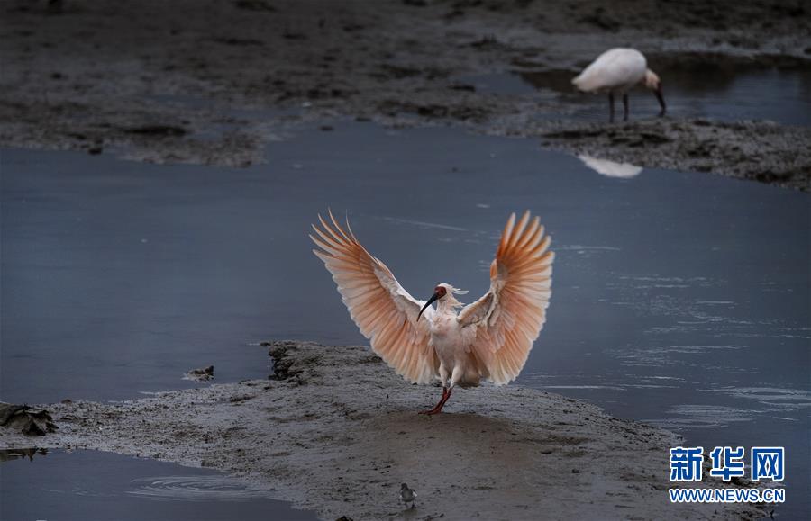 11月19日,朱鹮在漢江支流的牧馬河畔覓食。 新華社記者陶明攝
