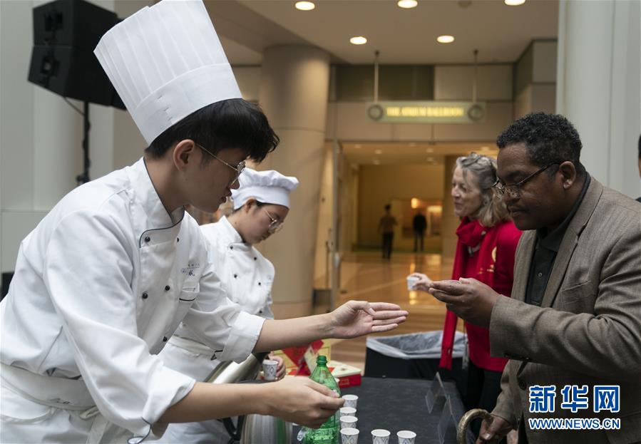 11月22日,在美國華盛頓,人們在“北京日”文化廟會活動上品嘗中國小吃。作為中國北京和美國首都華盛頓締結友好城市35周年慶?;顒拥囊徊糠?,“北京日”文化廟會22日在華盛頓羅納德·里根大廈和國際貿易中心舉行。新華社記者劉杰攝