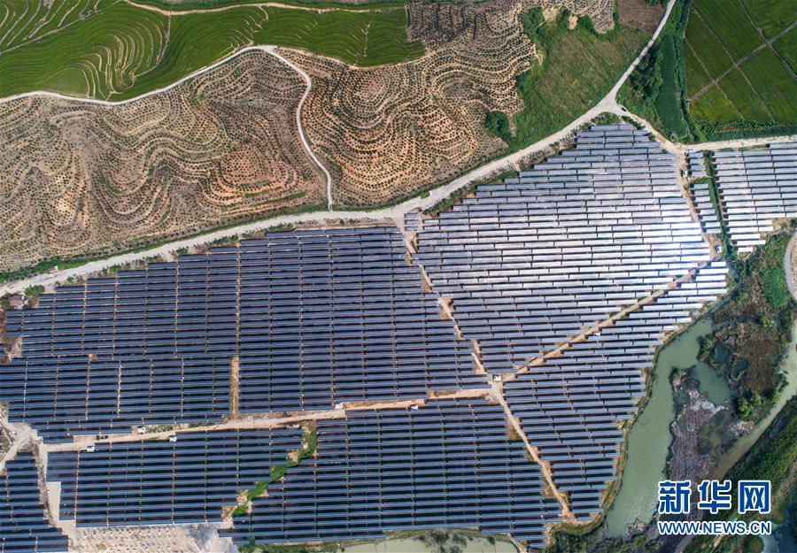 空中俯瞰湖州市埭溪鎮(zhèn)東紅村的光伏發(fā)電站(9月26日無人機拍攝)。該光伏電站占地2500多畝,是當?shù)貜U棄礦坑通過改造建成的“農光互補”光伏發(fā)電站。