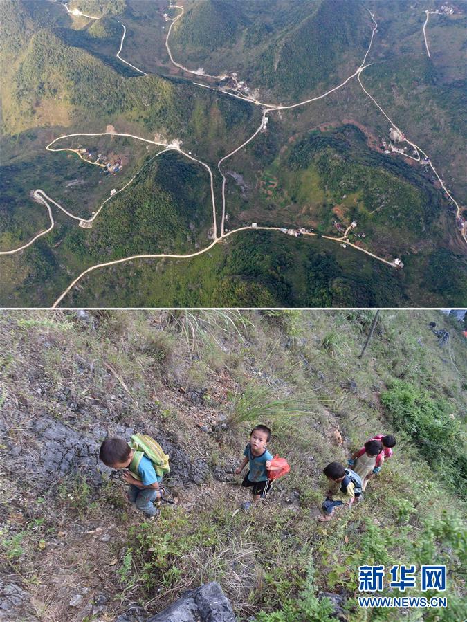 拼版照片:上圖為大化瑤族自治縣七百弄鄉(xiāng)弄雄村各自然屯之間的公路網(wǎng)(11月10日無人機(jī)拍攝);下圖為在弄雄村弄林屯,孩子們走在回家的山路上(2016年10月26日攝)。新華社記者黃孝邦攝