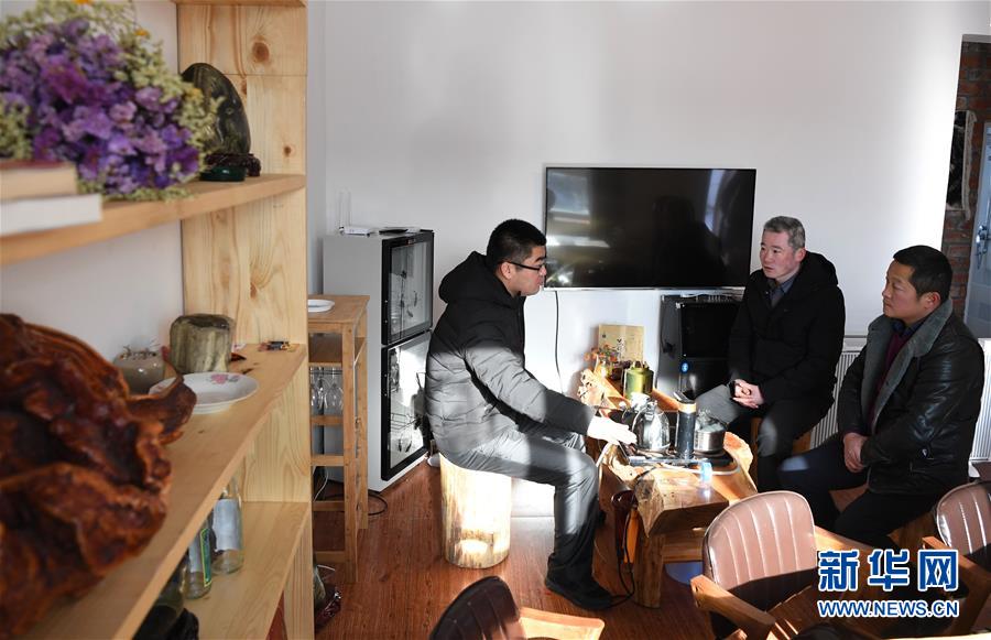 11月24日,在新疆吉木乃縣草原石城景區(qū)附近的吉木乃縣托斯特鄉(xiāng)塔斯特村,鄉(xiāng)黨委書(shū)記王繼江(左)與村民一起討論冬季游客接待事宜。新華社記者沙達(dá)提攝