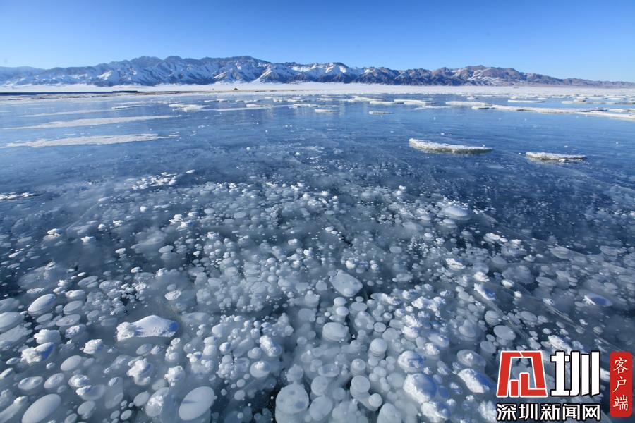 透過晶瑩剔透的冰面,可以看到一串串潔白氣泡分布在冰層中。