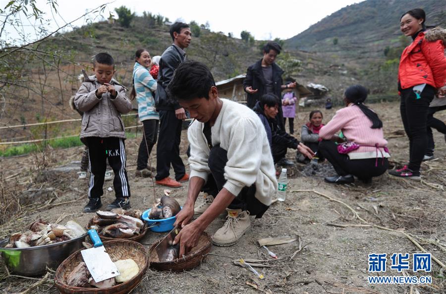 11月24日,在昭覺縣支爾莫鄉(xiāng)阿土列爾村,阿紅在切煮熟的豬肉和羊肉,準備跟鄰居分享。新華社記者江宏景攝