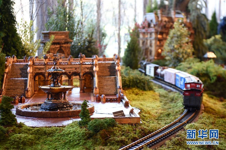 11月26日,在美國(guó)紐約植物園節(jié)日小火車(chē)展上,一輛模型小火車(chē)駛過(guò)紐約中央公園貝塞斯達(dá)噴泉和臺(tái)階微縮模型。新華社記者韓芳攝