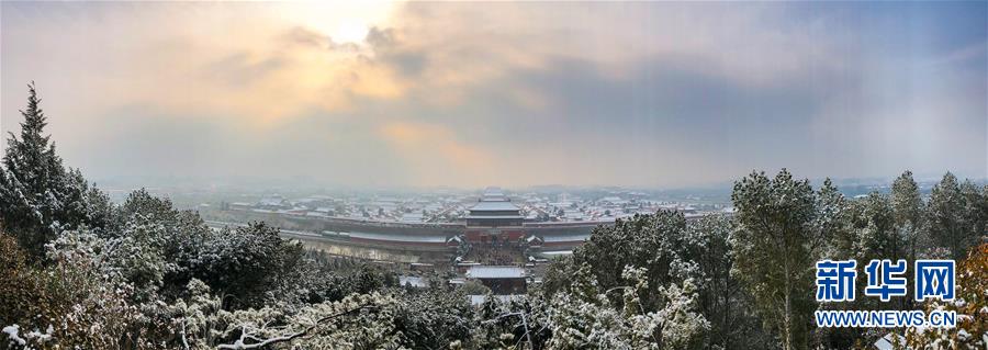 這是11月30日在北京景山公園萬春亭拍攝的雪后故宮(手機全景模式拍攝)。 新華社記者 沈伯韓 攝