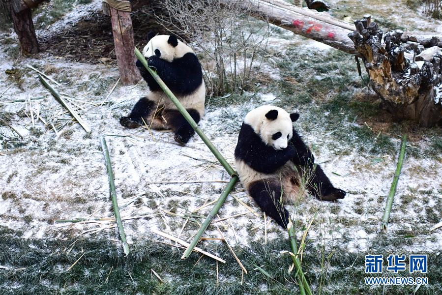 11月29日,在西寧熊貓館內(nèi),兩只大熊貓在吃竹子。 當(dāng)日,青海省西寧市迎來降雪,西寧熊貓館四只“萌寵”大熊貓在雪天里享受著吃竹子的樂趣。據(jù)了解,大熊貓生活的適宜溫度在26攝氏度至零下5攝氏度之間,冬季氣溫低于零下5攝氏度時,場館會啟用保暖設(shè)施。 新華社記者 吳剛 攝
