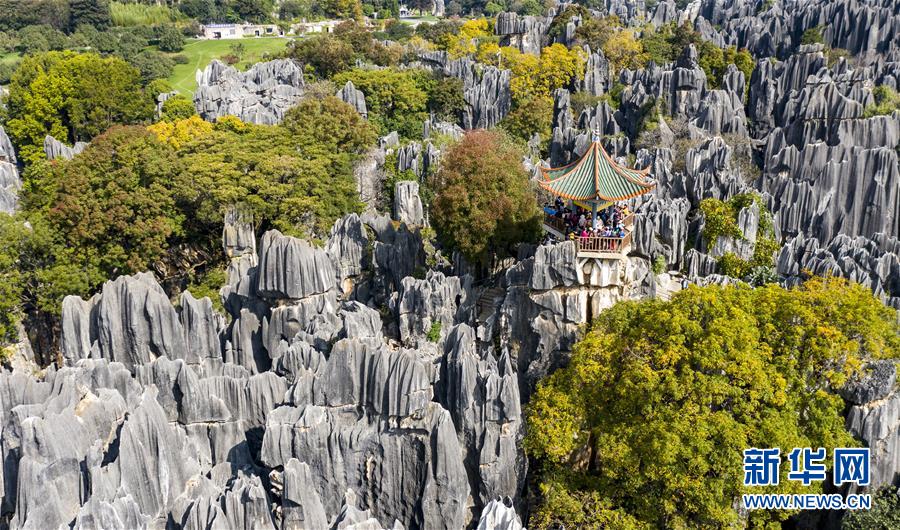 11月28日,游客在石林景區(qū)游覽(無人機(jī)拍攝)。新華社記者江文耀攝