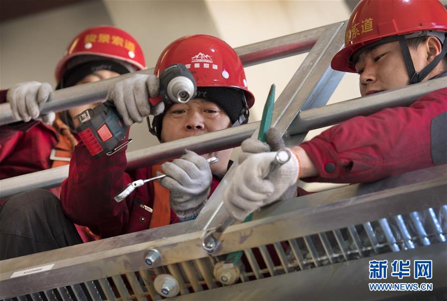華山太華索道檢修人員在進(jìn)行走臺(tái)螺栓緊固(12月5日攝)。新華社記者陶明攝