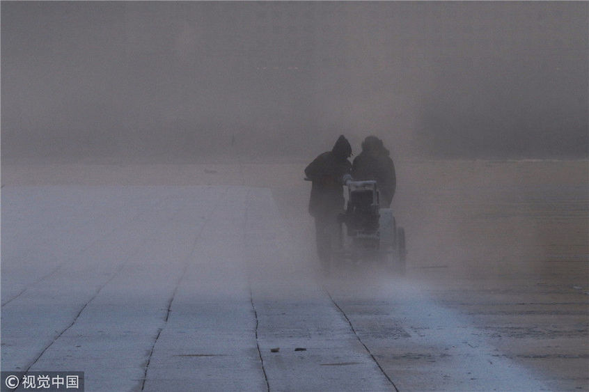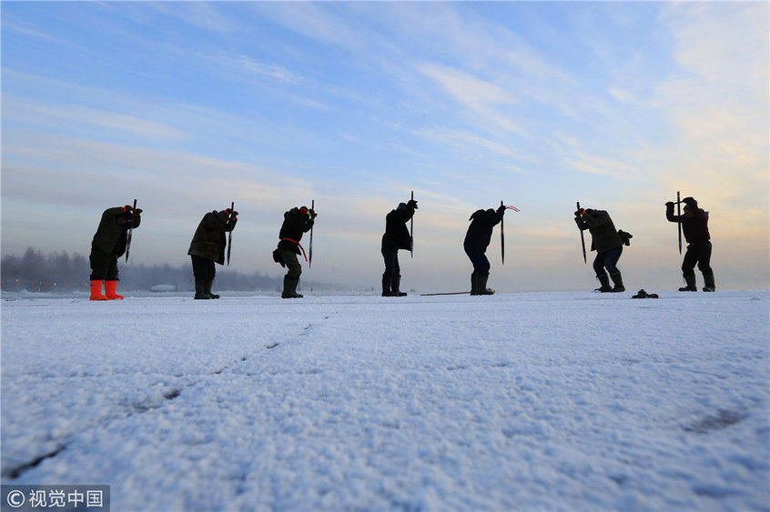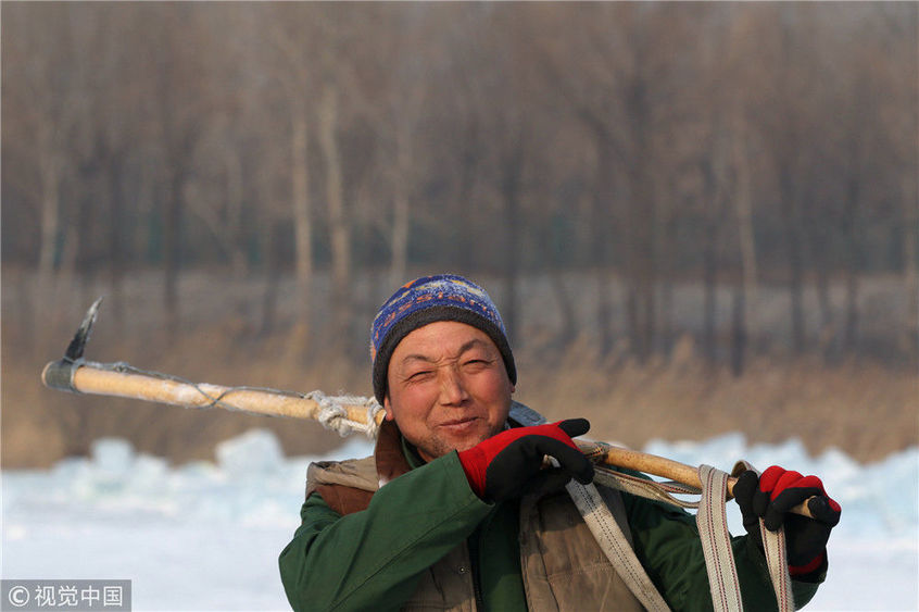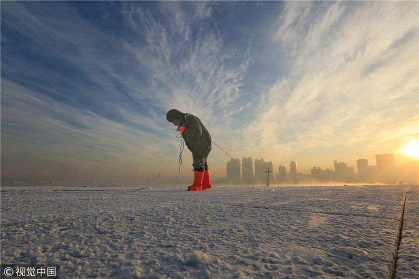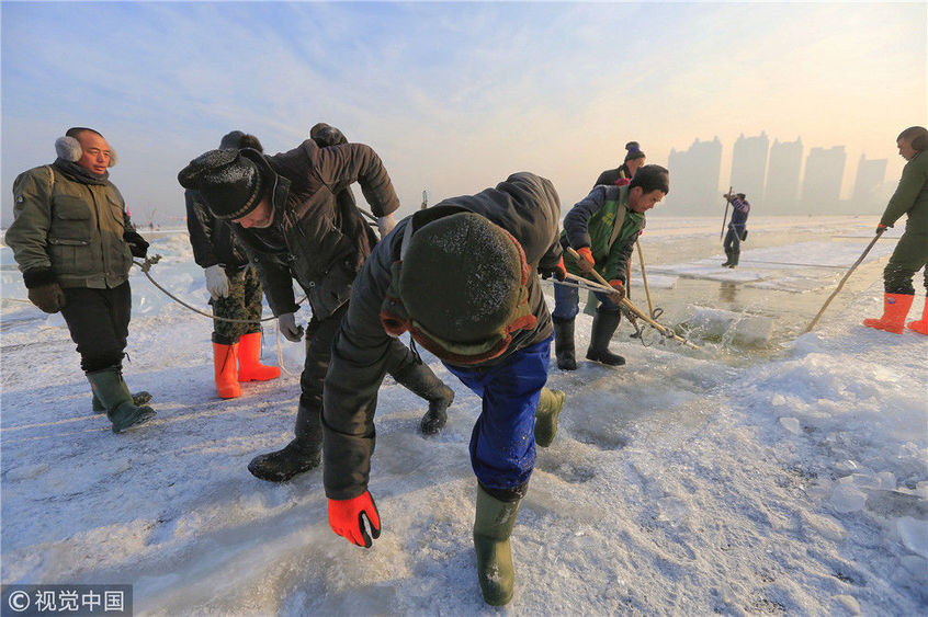 2018年12月11日,黑龍江省哈爾濱市,松花江上,采冰者們彎腰拉繩,宛如纖夫般拽重達(dá)半噸的冰塊出水。采冰者都是自哈市江北萬寶、東發(fā)、沙陀子等鄉(xiāng)鎮(zhèn)的農(nóng)民,他們每年冬閑時都會親屬、村鄰之間結(jié)伴到松花江畔采冰,有的采冰人,已經(jīng)連續(xù)干了二十多年。每個采冰季,他們每天要在冰面上工作10-12個小時,每個采冰組,一天要拽出冰塊2000-3000塊,一個近20天的采冰季,每人能收入近萬元。視覺中國