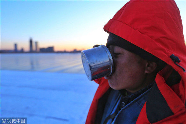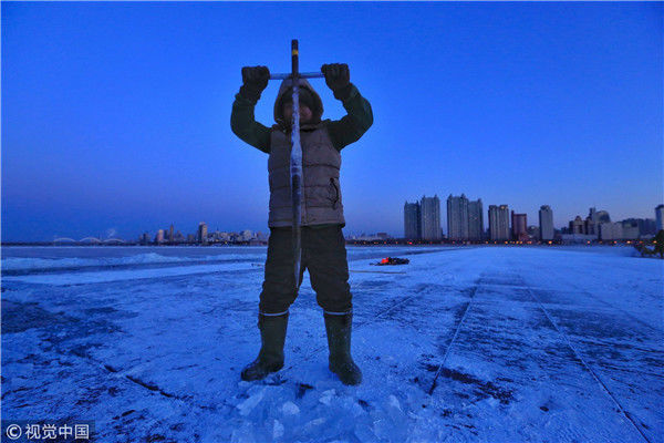 2018年12月11日,黑龍江省哈爾濱市,松花江上,采冰者們彎腰拉繩,宛如纖夫般拽重達(dá)半噸的冰塊出水。采冰者都是自哈市江北萬寶、東發(fā)、沙陀子等鄉(xiāng)鎮(zhèn)的農(nóng)民,他們每年冬閑時都會親屬、村鄰之間結(jié)伴到松花江畔采冰,有的采冰人,已經(jīng)連續(xù)干了二十多年。每個采冰季,他們每天要在冰面上工作10-12個小時,每個采冰組,一天要拽出冰塊2000-3000塊,一個近20天的采冰季,每人能收入近萬元。
