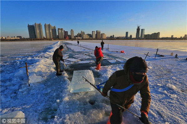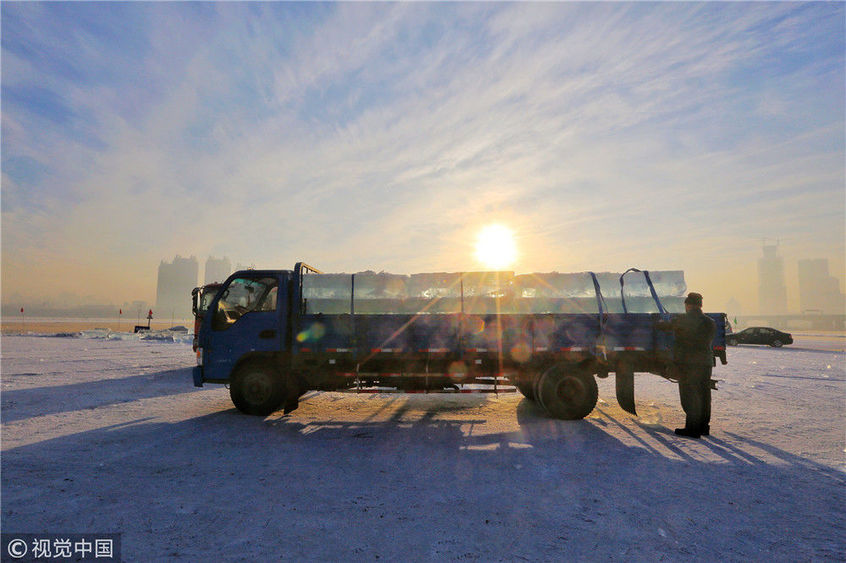 2018年12月8日,最低氣溫零下22度,哈爾濱市江北公路大橋東側(cè)的江面上,工人們正在從江中撈取冰塊,裝車運(yùn)往景區(qū)制作冰燈、冰雕?,F(xiàn)場,工人先是用電鋸、鐵釬將冰分割成半米多寬,一米多長的冰塊,接著將其拉出水面。等候在旁的叉車上前,將冰裝上運(yùn)冰的卡車,之后裝滿冰塊的卡車駛往景區(qū)。