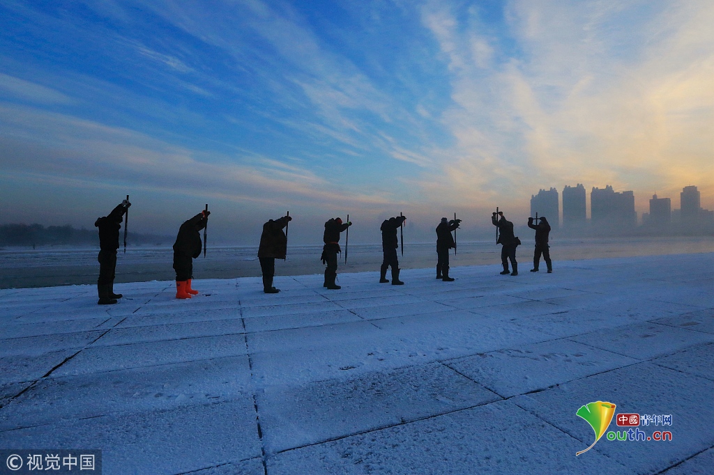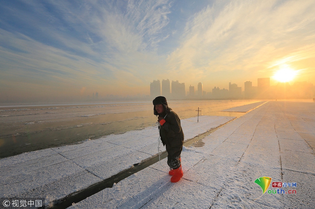 中國青年網(wǎng)2018年12月13日訊2018年12月11日,黑龍江省哈爾濱市,松花江上,采冰人在漫天霞光中破冰、采冰,金色光芒在水霧上升騰繚繞,給勞動的場面增添了詩意。