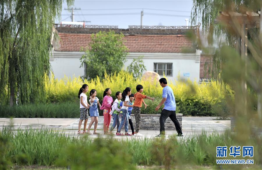 寧夏永寧縣原隆村的孩子們?cè)谛戮忧暗男蓍e廣場上玩耍(2018年8月攝)。新華社記者劉軍喜攝