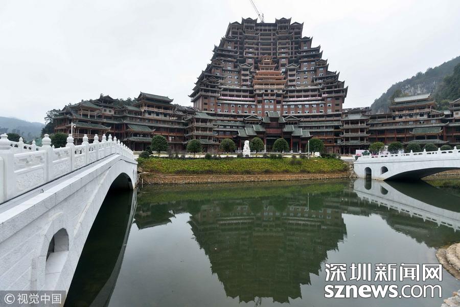 2019年12月8日,貴州省黔南布衣族自治州。位于獨(dú)山縣影山鎮(zhèn)凈心谷的水司府堂占地面積5900平方米,總建筑面積60000平方米,共24層,高99米,進(jìn)深240米,是世界上最高最大最壯觀的水族建筑,被稱為“天下第一水司樓”。