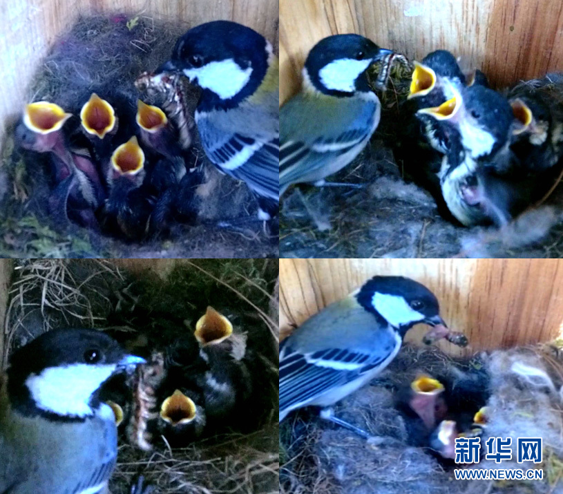 拼版照片:羅康在人工巢箱里安裝的錄像設備拍攝到鳥類在以松毛蟲喂食幼鳥(資料照片)。 新華社發(fā)