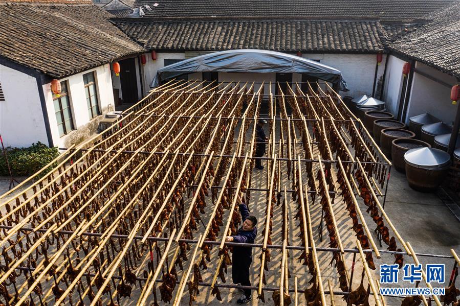 初冬時節(jié),浙江省紹興市柯橋區(qū)安昌古鎮(zhèn)開啟了傳統(tǒng)臘味制作、上市的季節(jié)。當?shù)匕傩沼脗鹘y(tǒng)醬油、黃酒、香料等手工腌制臘腸、醬鴨、魚干、醬鵪鶉、醬排骨等紹興特色醬貨,在冬季的陽光下進行晾曬,滿街飄香的臘味也成了這座江南古鎮(zhèn)的獨特風景。安昌古鎮(zhèn)是浙江省歷史文化名鎮(zhèn),有著一千多年歷史,比較完善地保存了古吳越地區(qū)沿襲千百年來的民俗風情。每年大雪節(jié)氣前后,安昌當?shù)匕傩瞻凑諅鹘y(tǒng)習俗挑選晴朗好天氣制作、晾曬傳統(tǒng)醬貨,各類醬貨顏色黑紅油亮,咸鮮適口,是當?shù)囟镜奶厣珎鹘y(tǒng)美食。新華社記者徐昱攝
