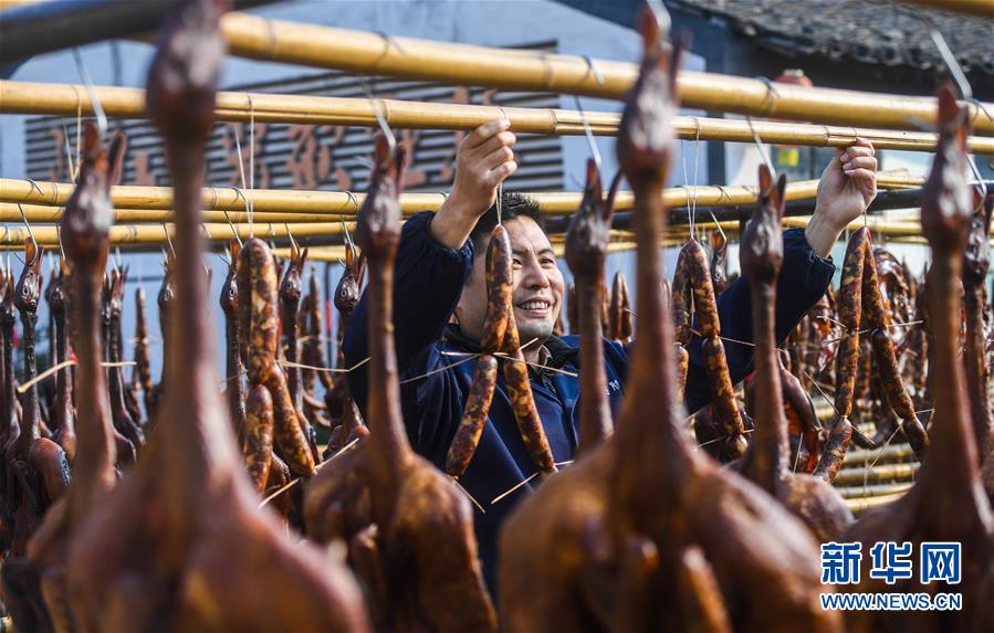 12月3日,安昌古鎮(zhèn)一家名為阿紅香腸的傳統(tǒng)臘味作坊里的工作人員在晾曬各種手工制作的紹興臘味。新華社記者徐昱攝